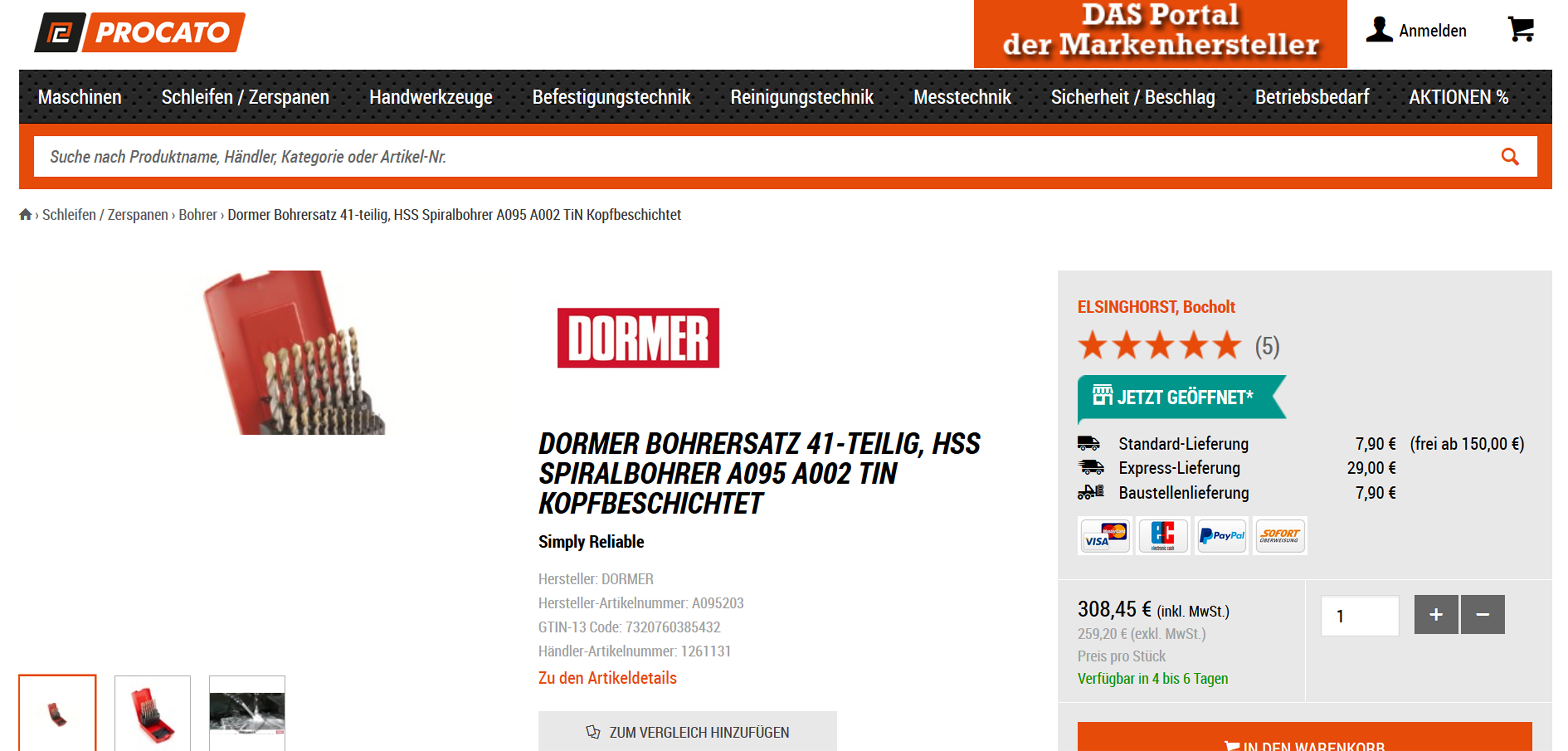 Erlangen, 28.01. 2015 – Die Präzisionswerkzeuge von Dormer Pramet sind künftig auch über die Online-Handelsplattform procato.de erhältlich. Der Erlanger Werkzeughersteller ist eine Partnerschaft mit der Stuttgarter PROCATO GmbH eingegangen. Derzeit sind bereits mehr als 7.000 Dormer-Werkzeuge für Bohr-, Fräs- und Gewindeschneidanwendungen verfügbar, darunter ein breites Sortiment an HSS-Spiralbohrern und HSS-Gewindebohrern.