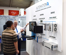 BU: Weltneuheit: Simon Smith, European Director Aerotech, erläutert Messebesuchern die neue Bewegungssteuerungsplattform Automation1 von Aerotech. Sie fungiert als komplette Maschinensteuerung und übertrifft eine reine "Bewegungssteuerung".