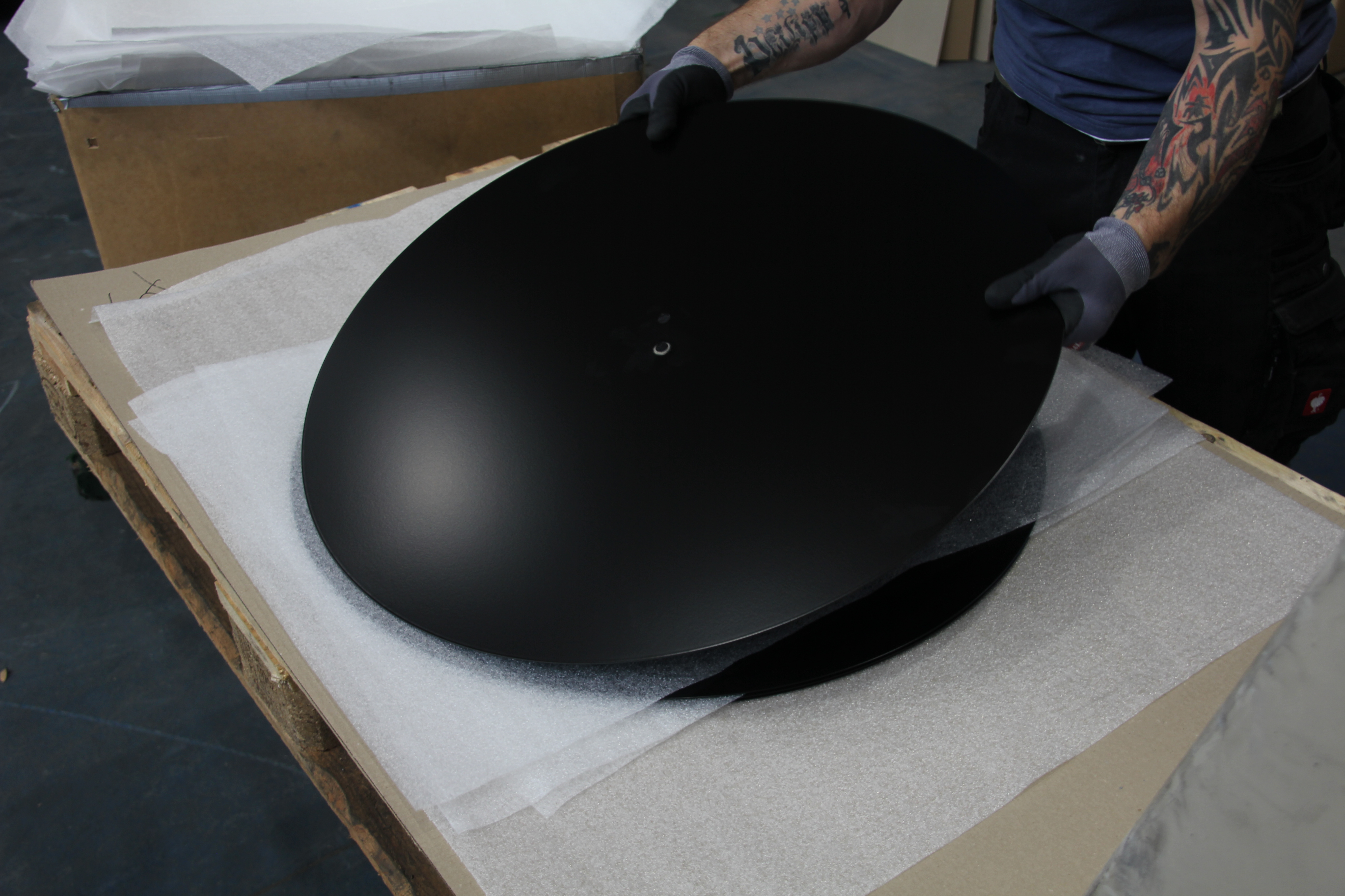 Bild: Komplettteil - Teller für einen Bistrotisch oder Bürotisch. Dieser wurde komplett bei Metallbau Nick hergestellt, d.h. gelasert, geschliffen, gesenkt, und pulverbeschichtet. Da keine Kratzer in die Oberfläche kommen dürfen, wurde das Produkt anschließend auch noch fachgerecht komissioniert.